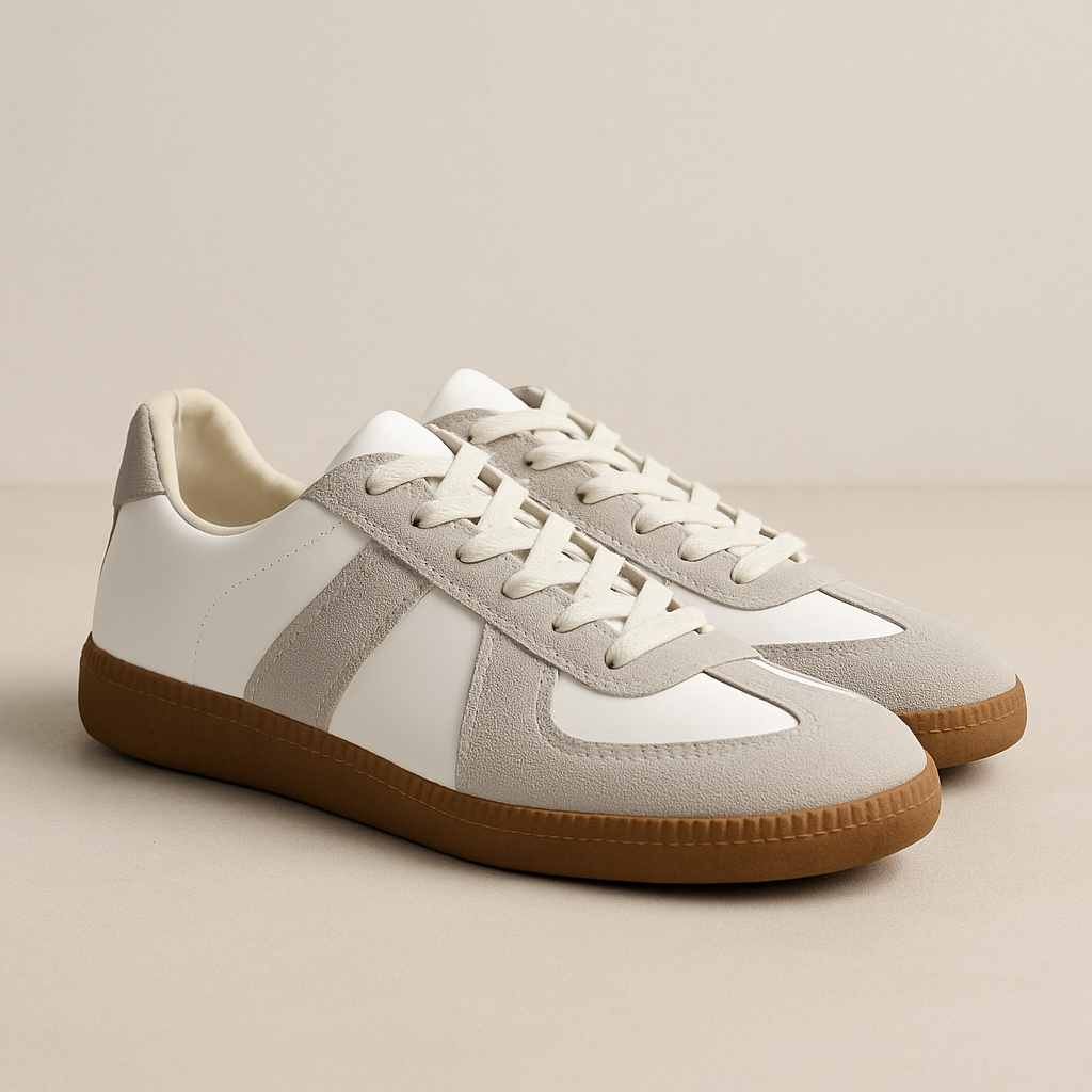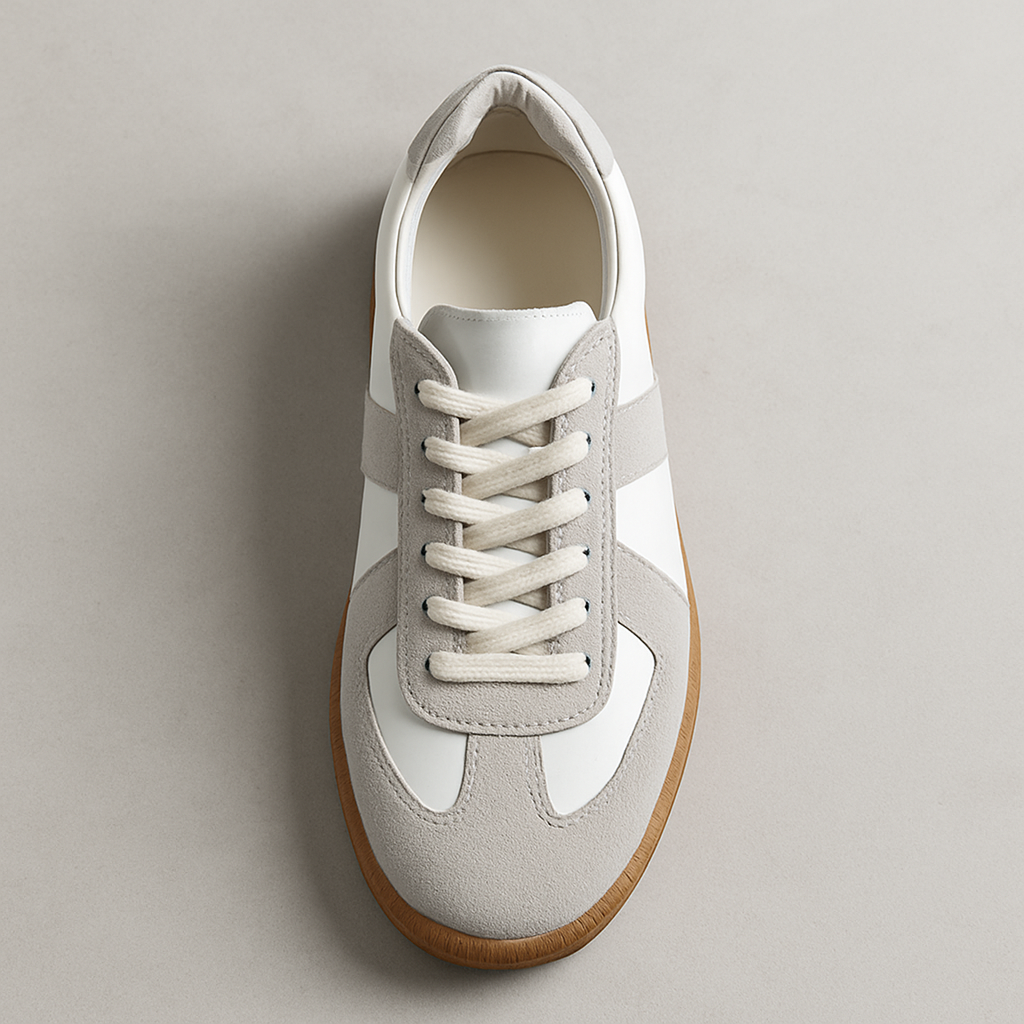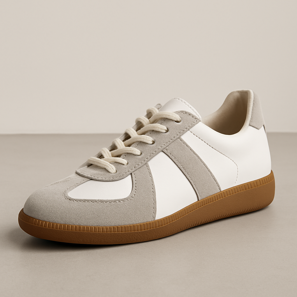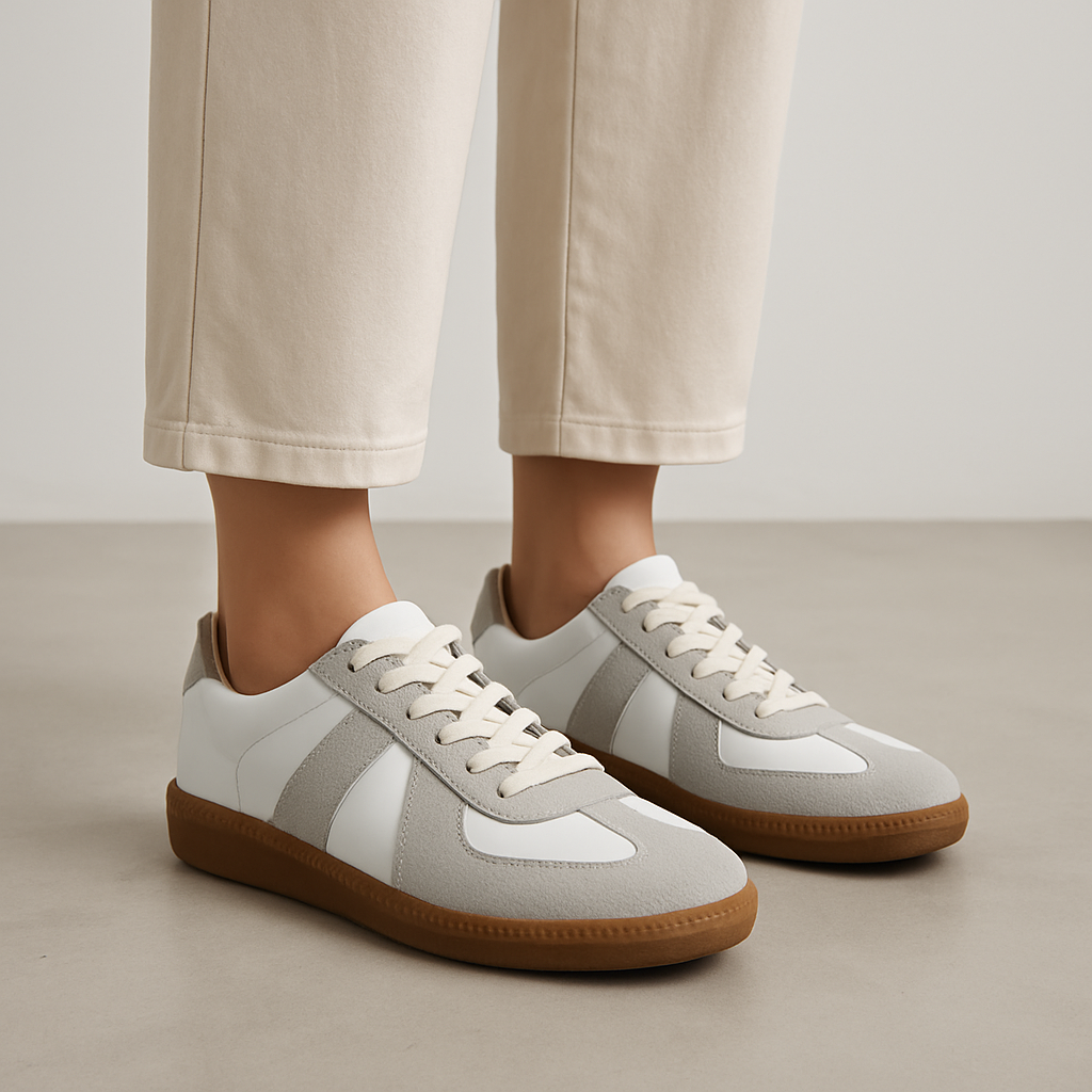 Frances har en låg och rak sula samt en form som följer en klassisk sneakerprofil. Ovandelen består av flera paneler i ljusa toner där material och färger skapar en tydlig indelning. Modellen har snörning som kan justeras efter behov och en rundad tå som ger en balanserad silhuett. Yttersulan är i en kontrastfärg och har ett mönster som kompletterar skons design.