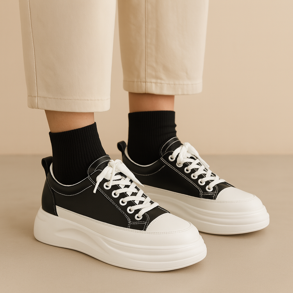Kris har en plattformssula med tydliga lager och en jämn profil. Modellen har snörning och markerade sömmar som följer ovandelens paneler. Färgkontrasten mellan det mörka och det ljusa skapar ett grafiskt uttryck, och silhuetten utgår från en klassisk sneakerform med rundad tå. Utseendet gör att modellen kan användas i olika vardagliga sammanhang och kombineras med flera stilar.